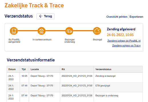 Dit komt omdat ‘Verzonden’ op de webshop betekent dat de order is overgezet naar het ordersysteem van PostNL, en nog niet per se dat het pakket op weg is naar het bezorgadres. Vanuit PostNL ontvang je een bericht wanneer het pakket op het depot is gearriveerd en wanneer het klaar staat voor verzending zodat je jouw pakket en de koerier hiervan kunt traceren. Let op: er moet altijd getekend worden voor ontvangst.